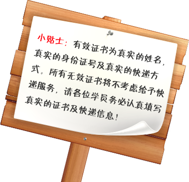 注:(1)課程證書快遞服務(wù)費(申通):¥10.00(可多證同郵,超重另計費) (2)證書制作費:暫定免費 (3)100唯爾將在證書申請成功后的15個工作日內(nèi),為有效證書進(jìn)行快遞服務(wù)。 |